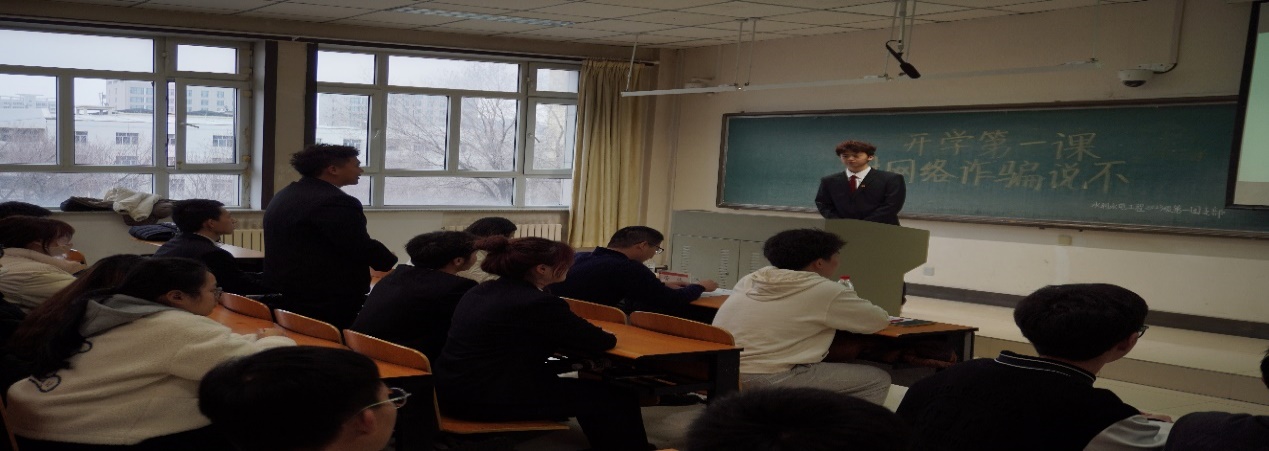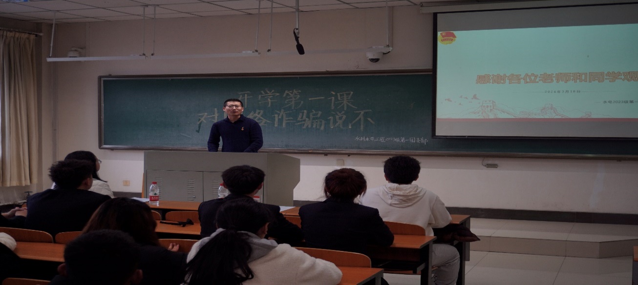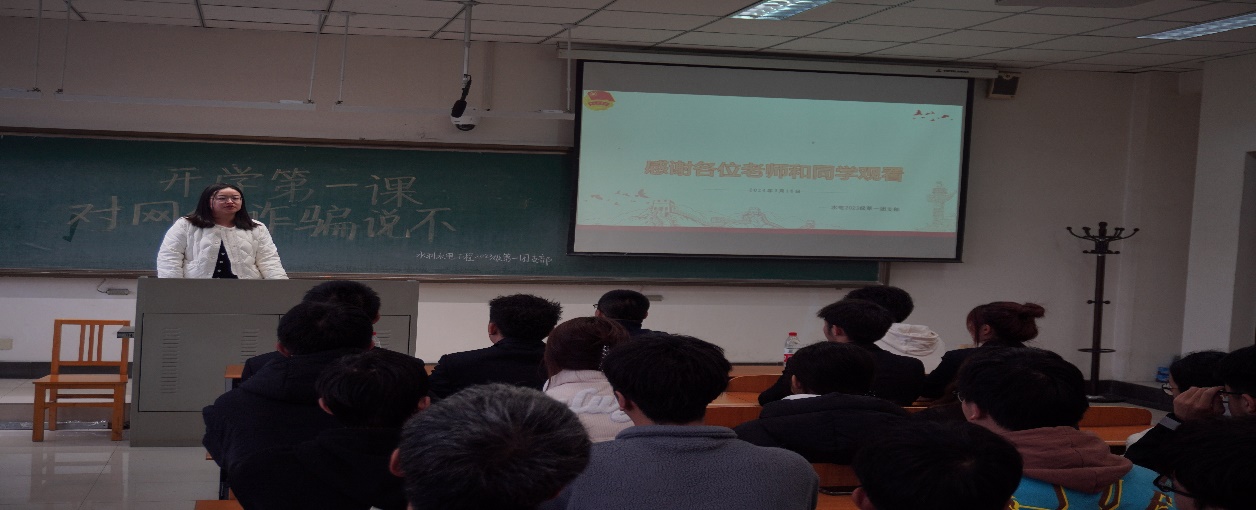 2023级水利水电一班于3月16日开展了“开学第一课:对网络诈骗说不”主题团日活动。此次活动由班级团支书田继宏主持,校团委书记管欣出席指导,班级34名学生共同参与。