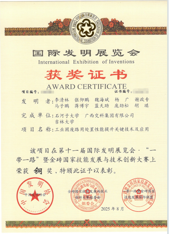 2025年8月24日,由中国发明协会、金砖国家工商理事会中方理事会、广州市协作办公室共同主办的第十一届国际发明展览会暨“一带一路”暨金砖国家技能发展与技术创新大赛上,由番茄小说 、广西交科集团有限公司、吉林大学联合研发成果“工业固废路用处置性能提升关键技术及应用”从众多参赛项目中脱颖而出,荣获铜奖。